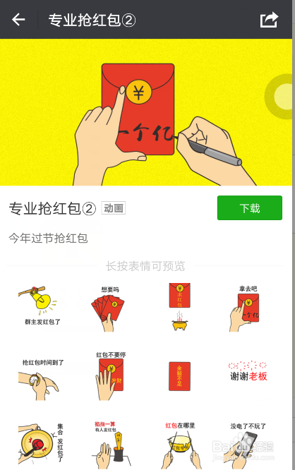 以【专业抢红包】为例,点击进入可以查看具体的脸色包里图片,若是感受可以,点击【下载】按钮下载即可