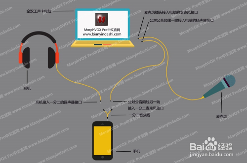 筹办一台安装了morphvox变音巨匠的电脑,最好是麦克风和扬声器接口分隔的电脑,若只有一个接口可备两条一分二音频线,一条用于电脑,一条用于手机。