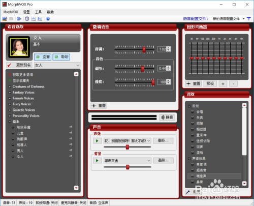 在电脑上打开morphvox变音巨匠,选择在左边栏选择假声结果。开启【聆听】功能,听一听结果如何,若是结果不对劲可以在【微调语音】、【图形平衡器】以及【音效】中进行手动调节。