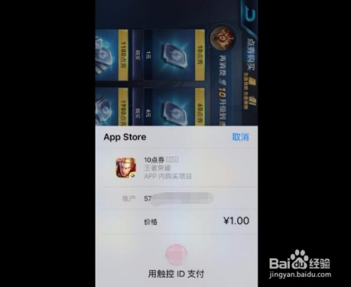 点击之后苹果手机就会主动跳出付出信息页面,我们输入我们的指纹识别信息就可以主动对王者荣耀里的点券进行充值了。