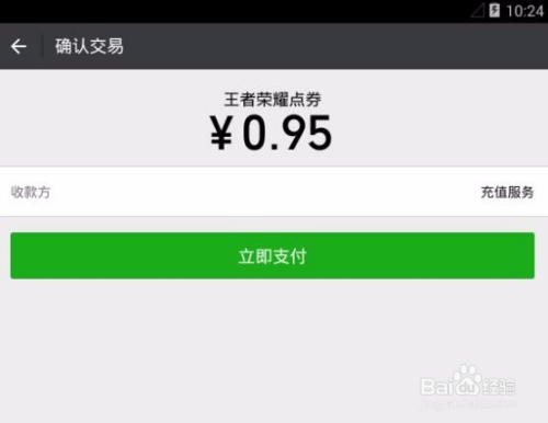 点击付出后就会打开我们手机上的微信软件,并生当作付出信息,我们点击确定付出,输入付出密码后就完当作了安卓手机的王者荣耀点券充值了。