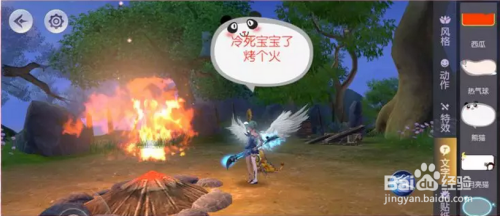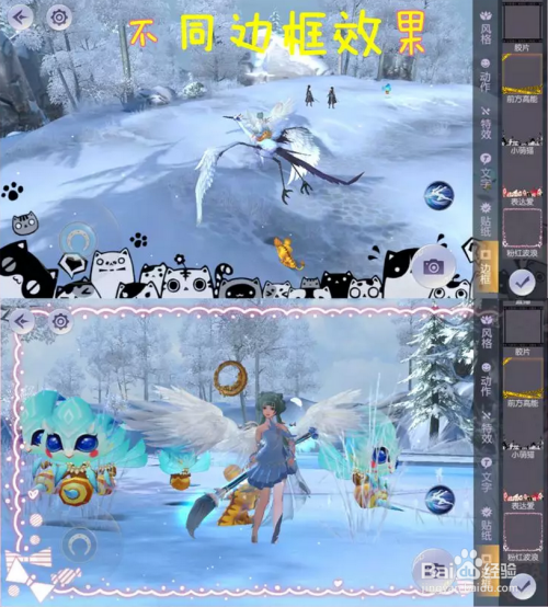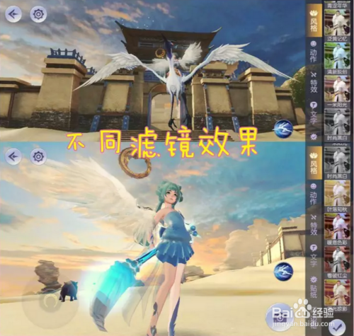 第三步:我们摆好姿势后再利用猛火如歌里面的特效按照场景添加契合场景的特效,如下图选择在樱花树下摄影时可以选择樱花飘动特效。在冬天雪地上时可选择雪花飘落特效,如下图所示。