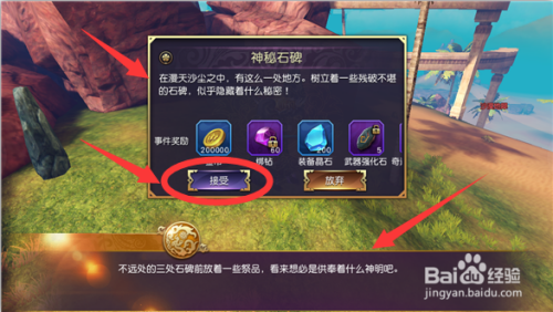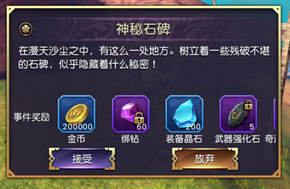 第二步,我们点击游戏界面左侧使命栏内新呈现的【发现事务——神秘石碑】,游戏会主动接管这个使命。我们在跳出的使命提醒中,点击【接管】即可。