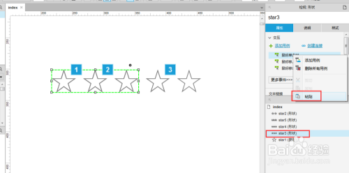 8. 直接复制星星的交互事务,给其他的星星行粘贴-->注重按照当前需要点亮的星星,点窜选中状况。如星星2点亮时,记得将刚复制过来的【星星2选中状况为“false”】改为【星星1选中状况为“false”】。