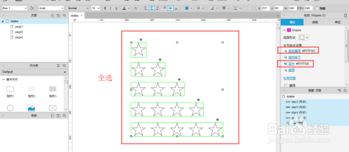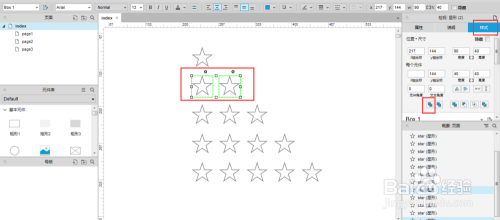 5.设置每行星星的【外形属性】:将星星全选-->【属性】-->【交互样式设置】下的【鼠标悬停】-->勾选【填充颜色】,设置填充颜色-->【交互样式设置】下的【选中】-->设置填充颜色同上。