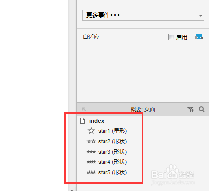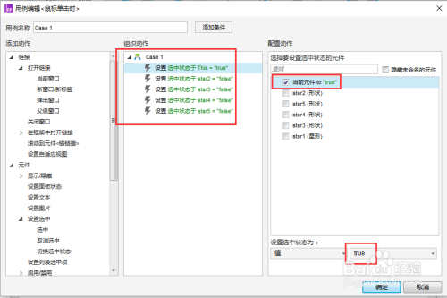 7. 添加交互事务:选择星星1-->双击【属性】下的【鼠标单击时】-->如下设置选中状况。