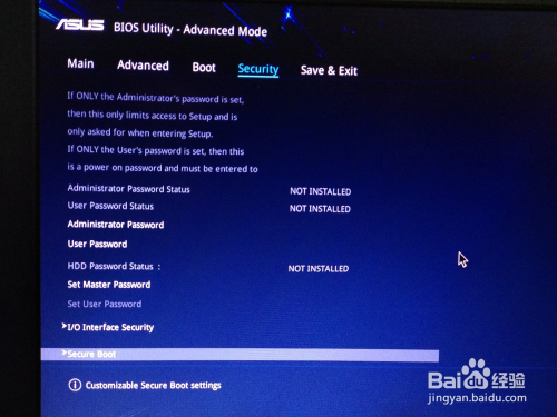 用键盘↑↓←→选择Security - 再选择下面的Secure Boot 然后按回车键进入