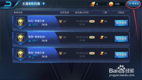 然后,我们在月赛页面的右上角找到‘领奖台 ’按钮,点击进入王者荣耀月赛领奖台页面 。