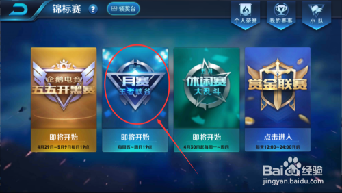 我们来到锦标赛页面之后,我们找到‘王者荣耀月赛 ’按钮,点击进入王者荣耀月赛页面 。