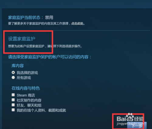 添加家庭监护之后会跳转抵家庭监护的选项下,这里点击设置家庭监护,按照本身现实环境选择所有游戏或者部门游戏。