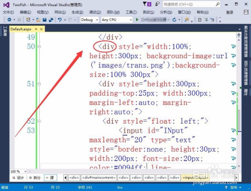 用Visual Studio打开一个已有的网页,本例为TwoFish网站的Default.aspx网页。