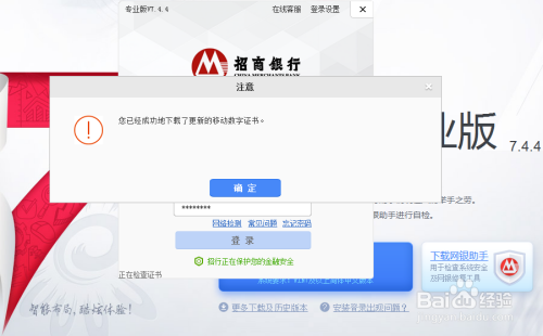 从头登录一次专业版→准确输入密码时会呈现“已当作功下载更新移动数字证书”的弹窗。