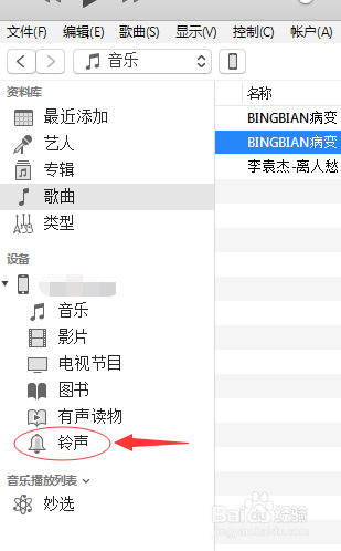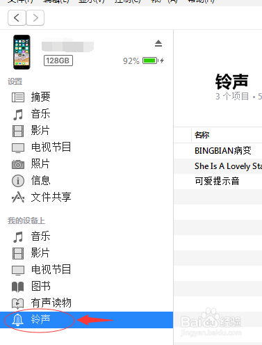此刻我们连上我们的iPhone手机,回到iTunes软件>>如下图所示>>单击我们的>>选择”铃声”(详见下图)