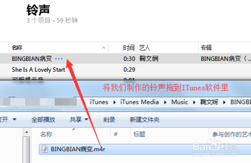 将适才我们改好的铃声片段文件拖沓到iTunes里来(详见下图)