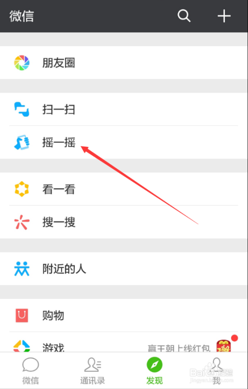 在微信发现选项卡里直接点击【摇一摇】选项,如下图所示。