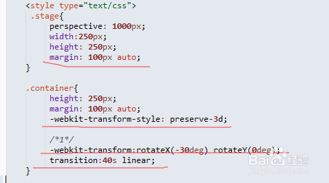 我们先节制 舞台 和容器 的样式,和设置一些关头属性,perspective 这个设置视距;-webkit-transform-style:preserve-3d;设置为3D(差不多这个意思),然后下面的-webkit-transform:rotateX(-30deg) rotateY(0deg);扭转一下容器让结果更好一点;