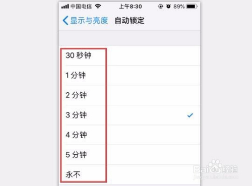 点击主动锁定进入具体的时候设置页面,在这个页面上我们就可以矫捷的设置苹果手机的锁屏时候了。