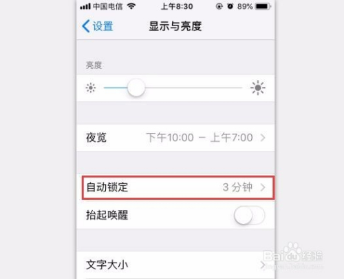 在显示与亮度页面,我们就可以看到主动锁定的设置功能了,默认环境下主动锁定的时候应该是3分钟。