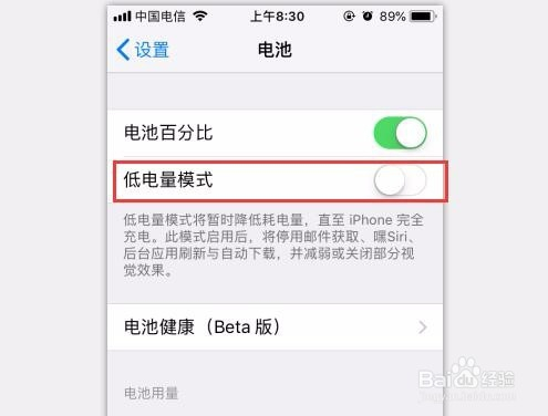 我们在电池设置页面就可以看到一个低电量的模式,将低电量模式滑动打开。