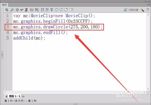 首先,打开动作面板,界说一个影片剪辑类变量mc,建立一个影片剪辑实例。