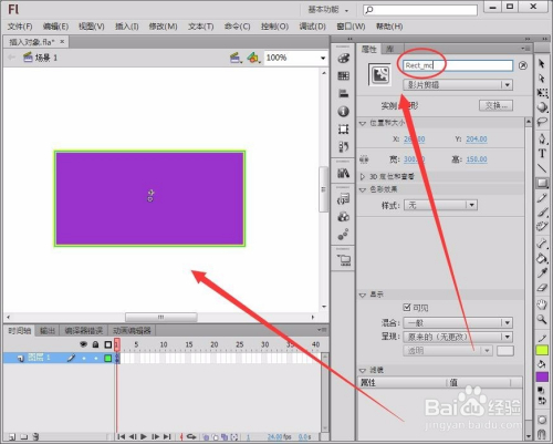 把元件拖动到舞台中,将实例名称取名为Rect_mc,一个对象就建立好了。