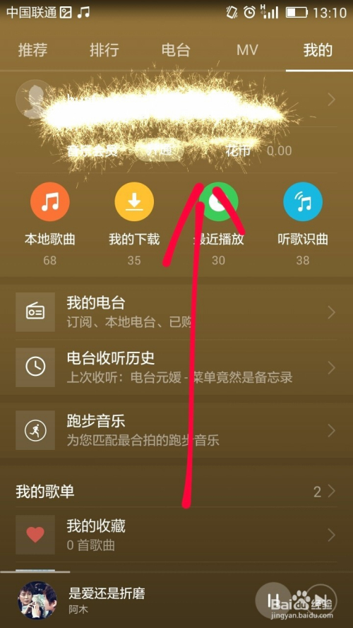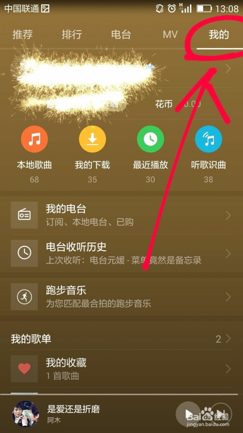 第二,在打开的音乐播放器首页中,我们选择页面上方的五个板块中的我的板块;