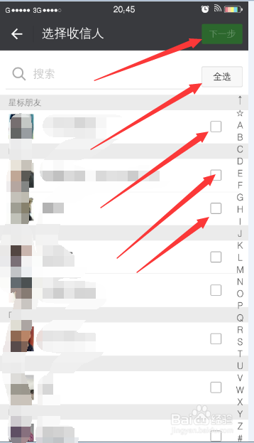 接着选择收信人,也就是选择老友,可以经由过程选择全选或者零丁选择某些联系人进行勾选,选择完当作后进入下一步,如下图所示。