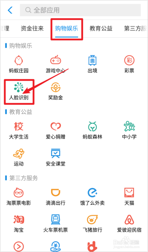 在【购物娱乐】里找到【人脸识别】;如图所示
