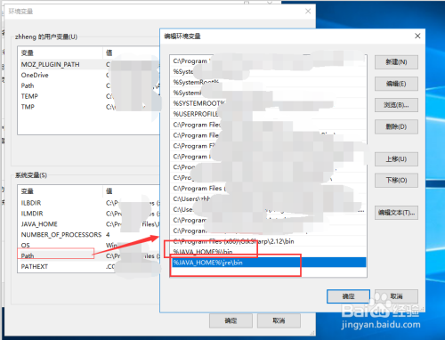 5. 情况变量中选择【Path】->【新建】,如下图所示,添加内容 %JAVA_HOME%\bin;%JAVA_HOME%\jre\bin ->点击确定。没有path的话,新建即可不区分大小写