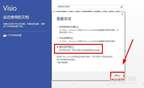 再次打开visio2013已经没有激活界面了,设置好首要事项,点击“接管”