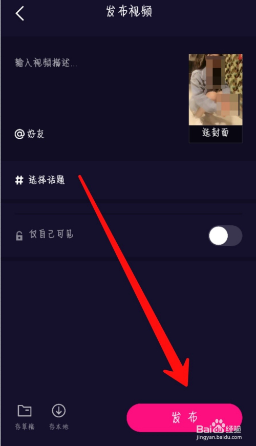 接着我们在发布视频的页面编纂视频描述、话题、等等信息之后点击右下角的【发布】。