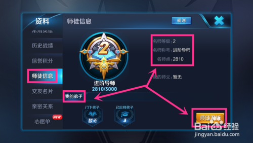 在小我游戏资料页面,点击左侧的师徒信息菜单,如图所示