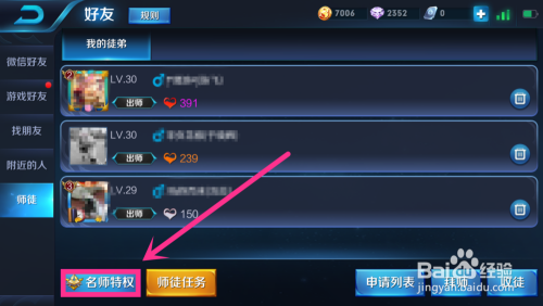 在老友页面左侧菜单中,进入师徒菜单可以查看师徒使命以及名师特权,如图所示。可是在名师特权中却看不到本身具体的名师点。
