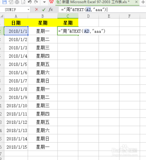 若是需要将日期转换当作“周一”的形式,则在选中单位格的编纂器处输入公式“="周"&TEXT(A2,"aaa")”如图,