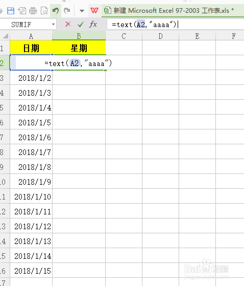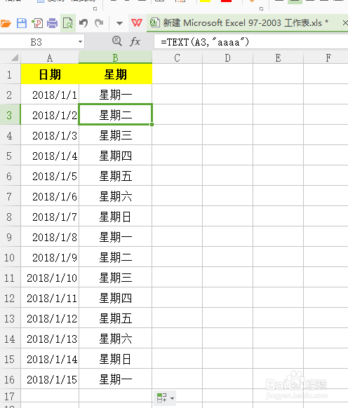 先选中B2单位格,在单位格编纂器处输入公式“=TEXT(A2,"aaaa")”如图