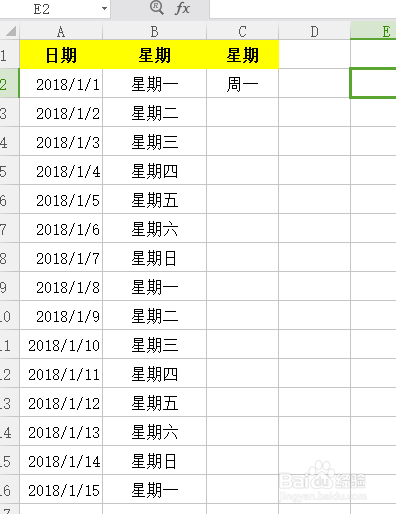 按回车即可,同样,若是要将表中全数的日期转换当作“周几”的格局,则可以在第一个转换礼拜的单位格即C2单位格的右下角,用鼠标拖动到需要转换的位置即可。如图