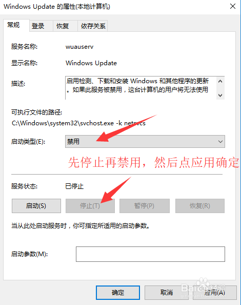 先点【遏制】-【应用】,再点【禁用】-【应用】,然后点击【确定】保留,此操作为封闭windows更新,使系统不再弹出进级,但一般环境下还需要进组策略禁用windows更新才行