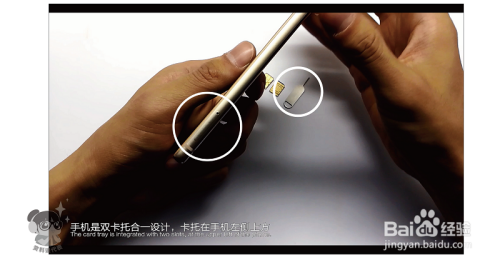 在关机状况下,在手机左侧上方找到卡托,利用顺手机附送的取卡针掏出卡托。
