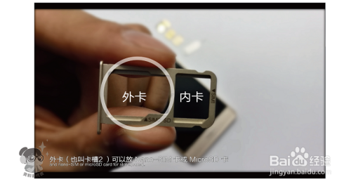 卡托上有插卡类型的文字提醒:内卡(也叫卡槽1)只撑持 Nano-SIM 卡,外卡(也叫卡槽2 )可以放 Nano-SIM 卡或 MicroSD 卡。