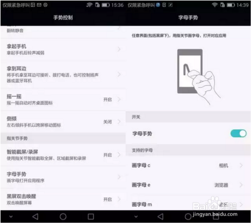 打开体例:【设置】-【智能辅助】-【手势节制】-【字母手势】。