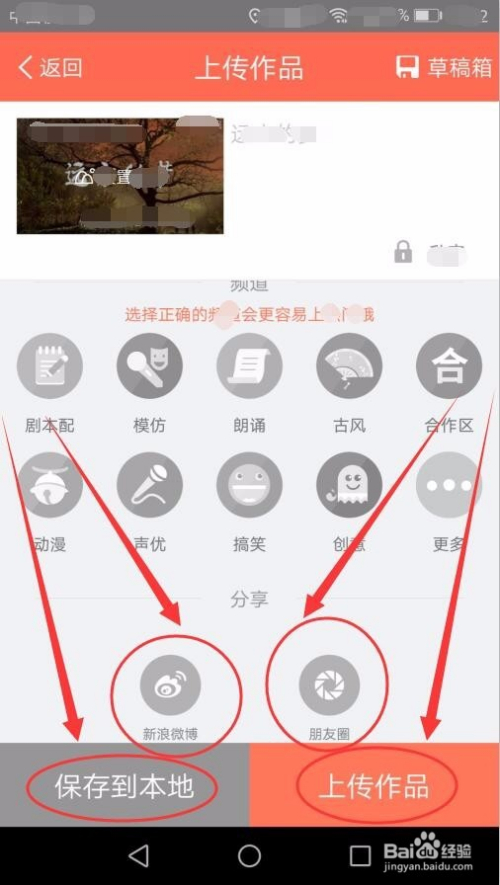 建造好配音后,可以把视频保留在手机中,也可以上传到收集,还可以分享到微信和新浪微博中。