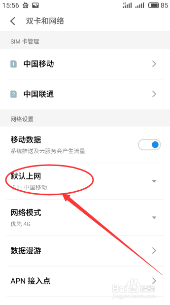 在双卡和收集界面中,找到默认上网选项,点一下后可以切换上网的SIM卡,切换后会有一段时候没有上网旌旗灯号。