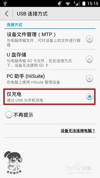 将需充电手机的USB毗连体例设置为仅充电。如许,手机就化身为姑且济急充电兵,阐扬它的余热啦~