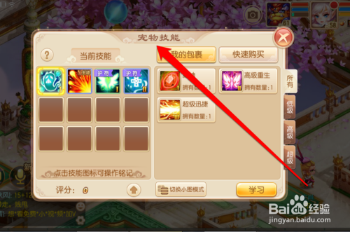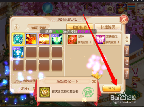 点击进修技术按钮后,进入宠物的技术界面。在宠物的技术界面,我们可以看到宠物的当前技术,和使命包裹内的宠物技术书。