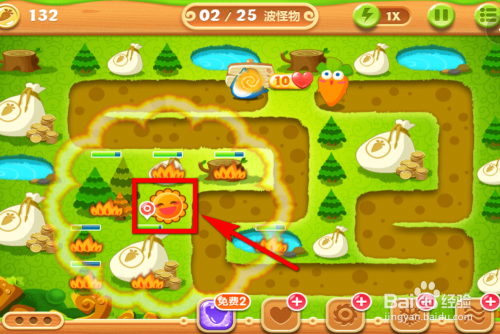 按照1-7步操作今后就有足够的进犯能力了,在玩家在戍守的同时对屏幕上的道具进行一一断根,并在道路四周随机建上良多的进犯塔。若是在游戏中碰到无法阻止怪物时,可以点击利用图示位置的免费道具,如许可以实现快速清屏。