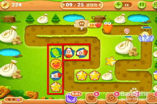 在完当作对荷包的断根今后,就用第一个进犯塔来断根图示位置的道具,道具断根今后这里会露出来两个五星进犯塔。若是有足够的萝卜,那么就将这两个五星塔升到第一流别。