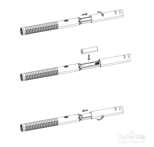 扭转管体,打开电池仓;放入电池;扭转管体,封闭电池仓。