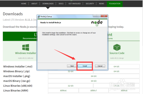 然后点击【Install】按钮,筹办安装Node.js,如图: