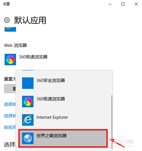 找到web浏览器那栏点击当前默认的浏览器,在新的列表中找到宿世界之窗并点击。