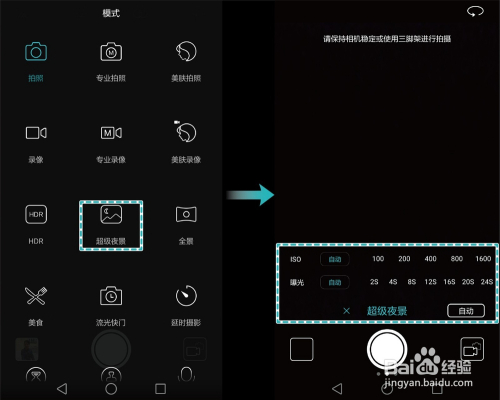 点击超等夜景,即可进入该模式。针对ISO和曝光可以进行出格选择,拍出心中的年夜片。